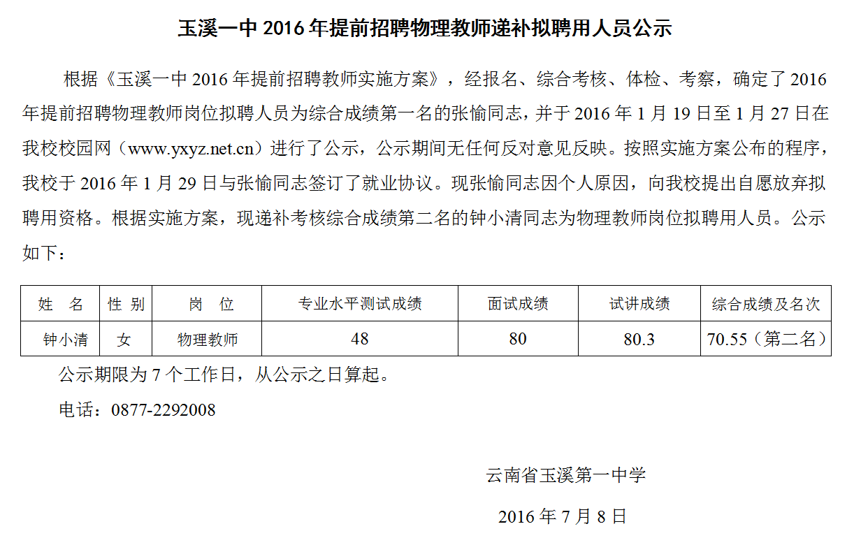 玉溪一中2016年提前招聘物理教师递补拟聘用人员公示